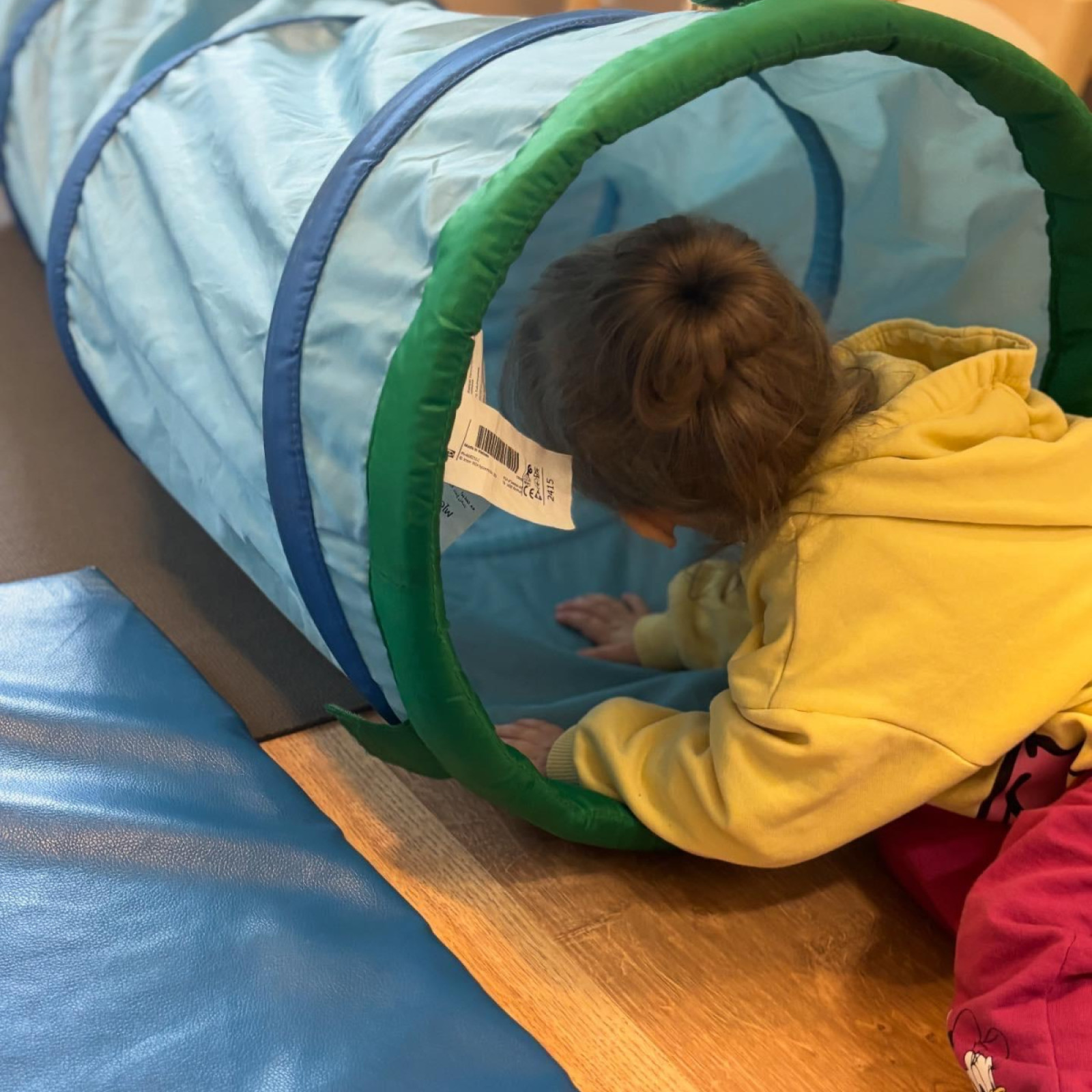 Bewegungssituationen im Alltag sind offen gestaltet und anpassbar. Materialien wie Matten, Tunnel, Bälle oder Balanciermöglichkeiten laden zum Ausprobieren ein und können von den Kindern auf unterschiedliche Weise genutzt werden. Jedes Kind entscheidet selbst, wie intensiv es sich beteiligt und wie lange es bei einer Bewegung bleibt. Diese Freiheit gibt den Kindern die Möglichkeit, im eigenen Tempo Erfahrungen zu sammeln und Sicherheit zu gewinnen.